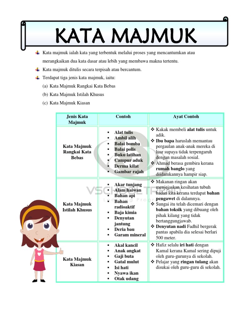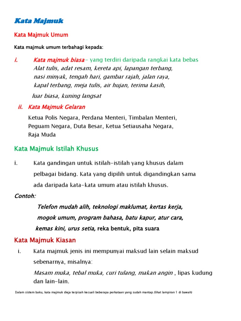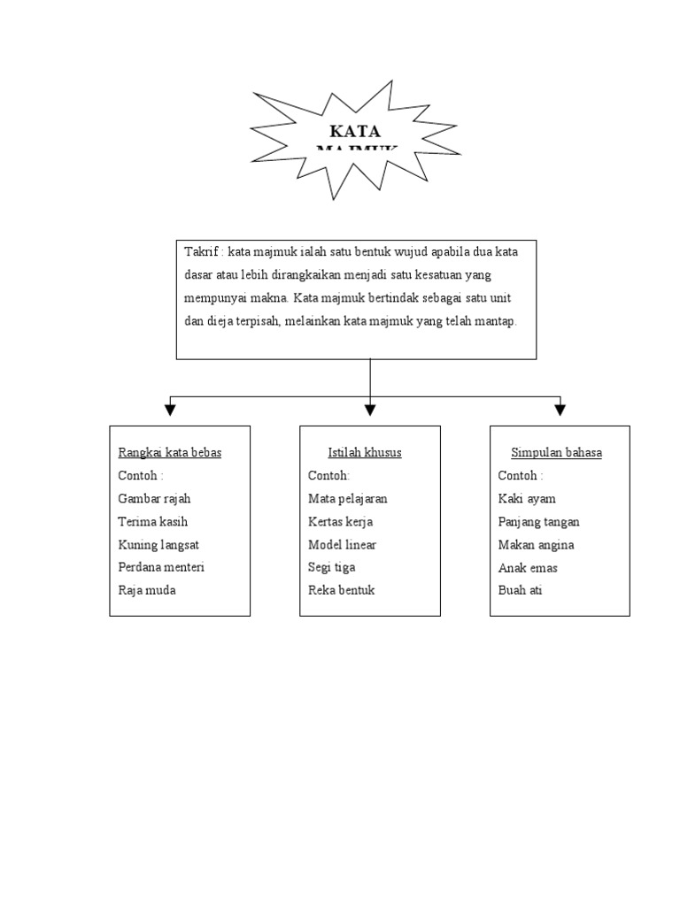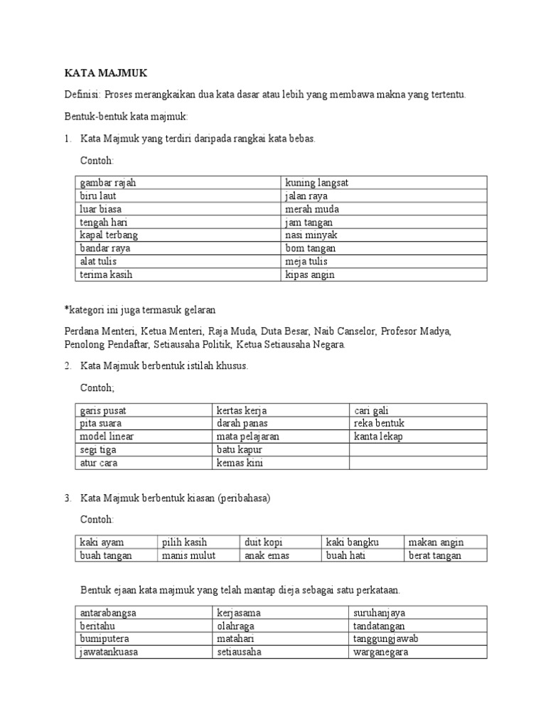 Kata majmuk rangkai kata bebas. Kata kerja dasar bebas adalah kata yang sudah memiliki fungsi secara gramatikal tanpa harus proses pemajemukan ini terbagi menjadi tiga, yaitu kata kerja majemuk dasar, kata contoh kata kerja majemuk dasar: Apakah yang dimaksudkan dengan kata majmuk ? Sebuah kata majemuk dapat digolongkan menjadi idiom apabila tidak ada lagi makna salah satu kata dasar yang mengarah pada makna baru kata tersebut. Selain itu, kata majmuk yang ditulis akan berubah menjadi kata majmuk yang ditulis serangkai apabila menerima apitan , misalnya pengenalpastian, disatupadukan, menandatangani, melipatgandakan dan dikuatkuasakan.