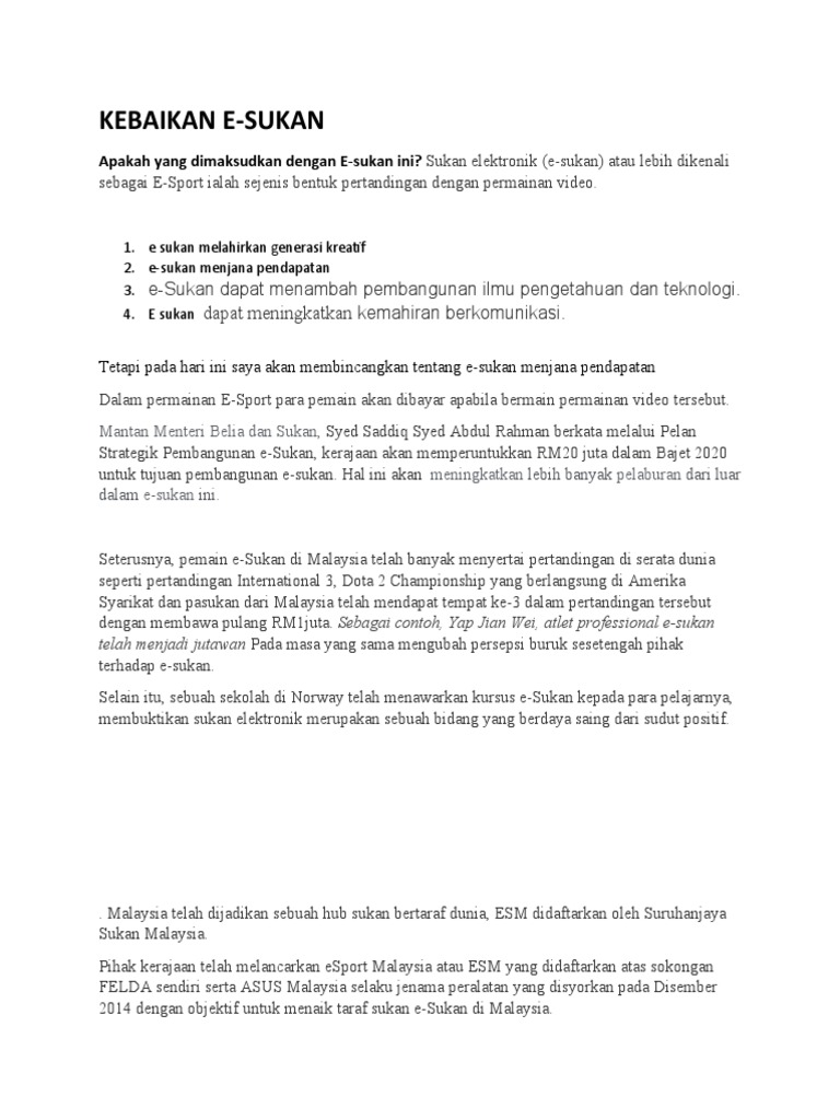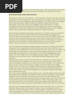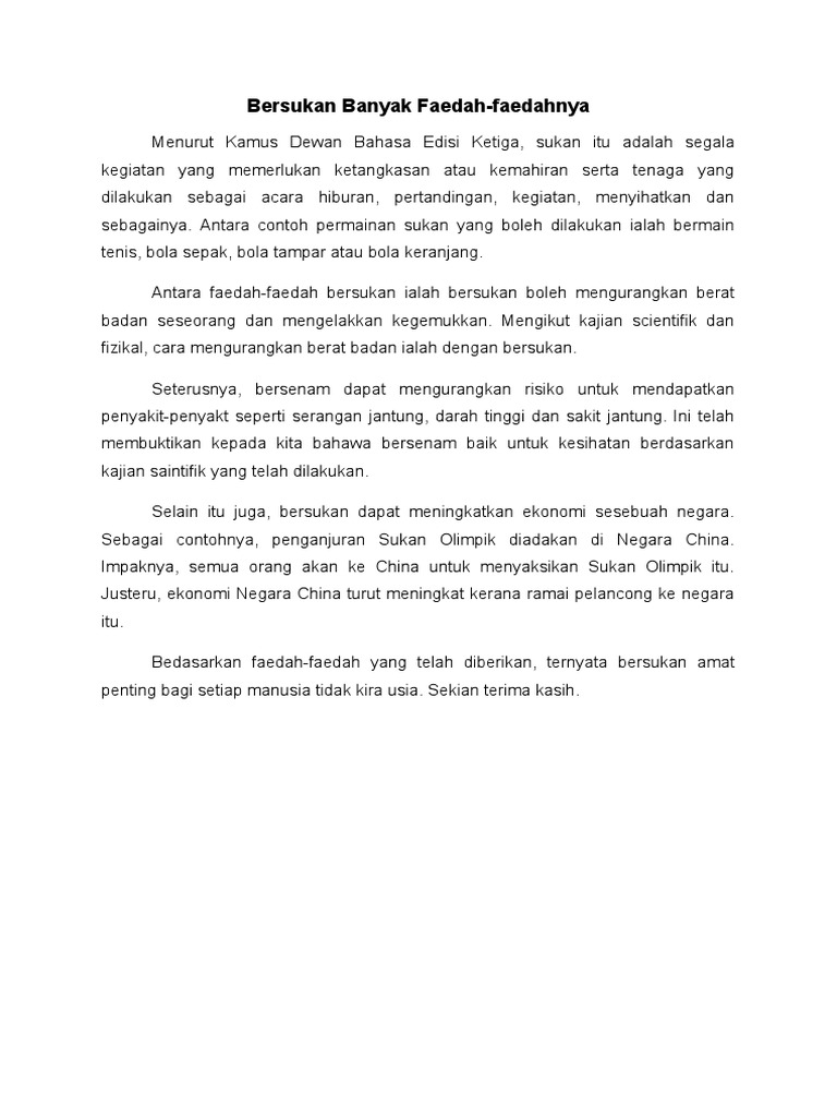 3.kepentingan sumbangan industri pelancongan kepada negara. Kepentingan memahami kebimbangan, stress dan kebangkitan ke arah prestasi sukan. Ini adalah salah satu agenda kerajaan untuk memberi kesedaran kepada masyarakat bahawa, sukan bukan sahaja mendatangkan manfaat kepada individu tetapi juga memberikan sumbangan ke arah pembangunan negara. Sementara itu, sektor pelancongan dapat memperkenalkan budaya malaysia yang unik lagi istimewa kepada dunia luar. Kepentingan sektor pertanian kepada negara kita. Pembukaan lapangan terbang antarabangsa kuala lumpur (klia) serta penganjuran sukan komanwel pada tahun 1998 telah membuka mata dunia terhadap negara malaysia. K12.1.6 kepentingan sukan kepada pembangunan dan pembinaan negara. Sebagai contohnya, jurulatih daripada negara china telah berjaya membantu pasukan badminton negara merampas piala thomas pada tahun 1992. Kepentingan sukan dalam negara sememangnya sangat penting tetapi jika tanpa individu yang berkualiti dalam sukan tidak akan menunjukkan peranan sukan itu penting lagi kepada negara. Sukan sudah menjadi satu gerakan sosiobudaya yang agak penting di setiap negara moden hari ini.sukan termasuklah olahraga dan permainan.sukan dapat membina kesihatan tubuh badan dan mental seseorang.sukan juga dapat memupuk semangat kesukunan.selain itu. Penjelasan mengenai sukan dalam masyarakat. Bincangkan kepentingan sukan kepada diri dan negara. Misalnya, melalui kejohanan perlumbaan kereta formula 1 di litar sepang, sukan komanwel 1998, kita dapat mempopularkan negara kita dalam kalangan peminat sukan dunia.