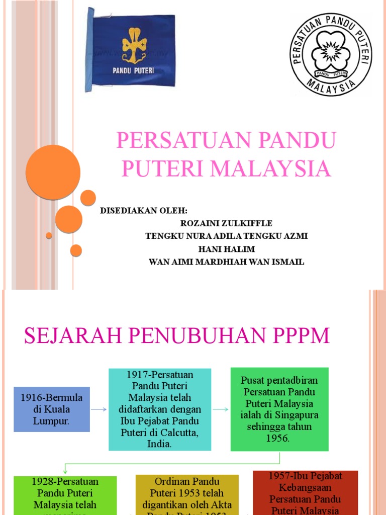 1964 dame leslie whateley, pengarah biro dunia telah memberi pengiktirafan persatuan pandu puteri malaysia, gabungan persatuan pandu puteri sabah. Persatuan pandu puteri malaysia menyediakan program kepanduan yang bercorak pendidikan bukan formal. 1957 persatuan pandu puteri malaya diterima bergabung dengan wagggs (persatuan pandu puteri dan pengakap sedunia). Tamat sudah projek fyp ni. Semenjak tahun 1928 persatuan pandu puteri malaysia telah menerima pengiktirafan dan sokongan daripada kerajaan malaysia.